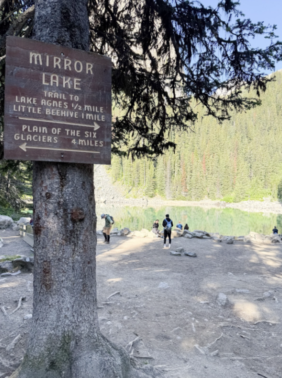 We started our hike toward Mirror Lake—an hour, moderately steep, very scenic. From Mirror Lake, we continued to the Lake Agnes Tea House. Cute, charming, and full of tourists all pretending to “earn” their carbs. Lake Agnes itself is gorgeous and turquoise, with fish casually living their best lives.